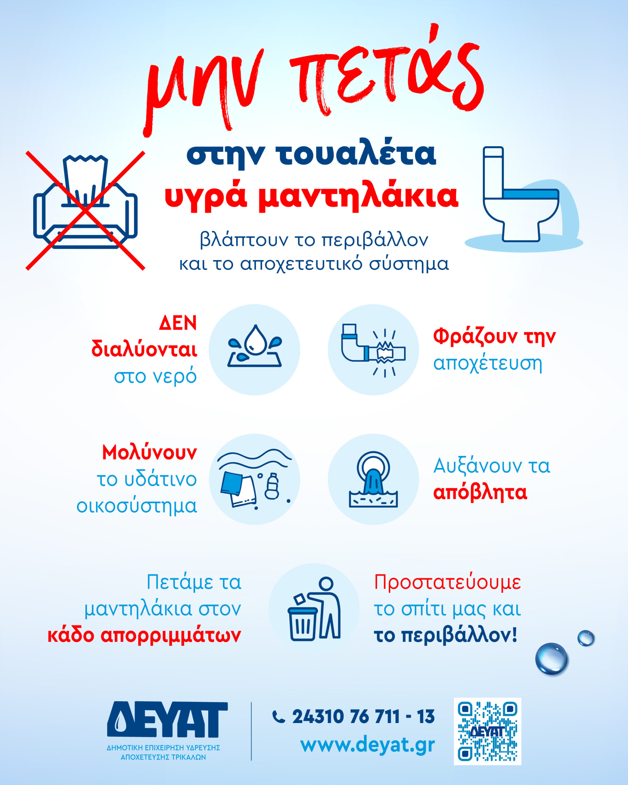 Η δεύτερη καμπάνια αφορά κάτι φαινομενικά απλό: τα υγρά μαντηλάκια στην τουαλέτα. Διότι «δε διαλύονται στο νερό», «φράζουν τη αποχέτευση», «αυξάνουν τα απόβλητα» και πολλά άλλα δυσάρεστα για το σύστημα αποχέτευσης.