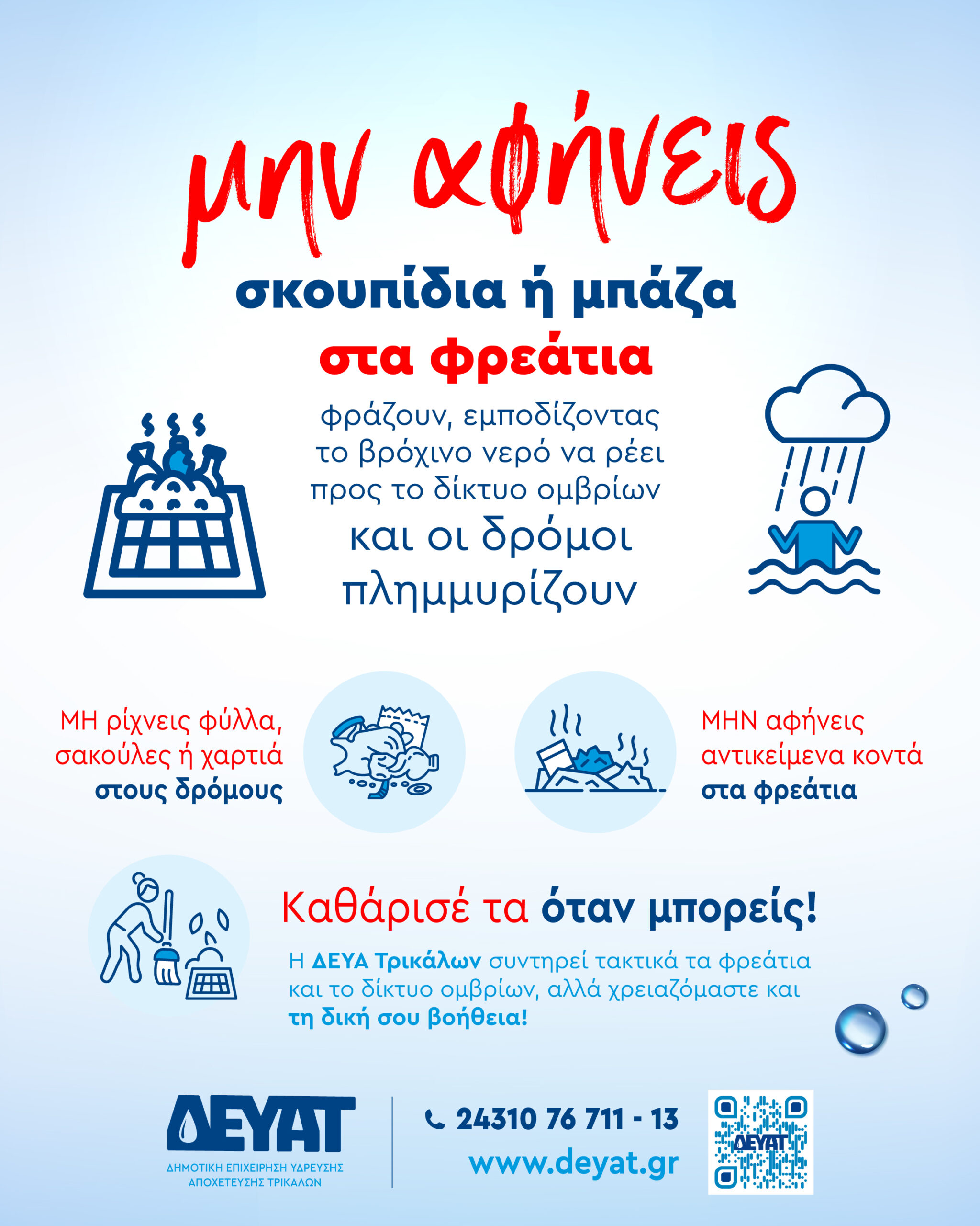 Η τρίτη καμπάνια αφορά στα φρεάτια. Η ΔΕΥΑΤ προτρέπει για απλές ενέργειες: «μην αφήνεις σκουπίδια ή μπάζα στα φρεάτια», «μη ρίχνεις φύλλα ή χαρτιά στους δρόμους», «μην αφήνεις αντικείμενα κοντά στα φρεάτια».